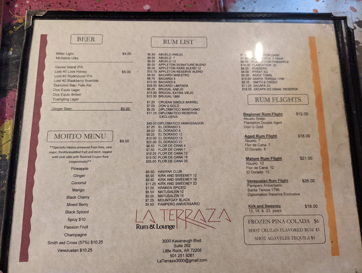 Welcome to La Terraza Rum & Lounge, a hidden gem nestled in the back of the Prospect Building at 1501 N University Ave, Little Rock, AR. This vibrant establishment fuses Venezuelan and Mediterranean flavors to create an unforgettable dining experience. With a cozy atmosphere and an inviting patio, it’s a perfect spot for both intimate dinners and lively gatherings.